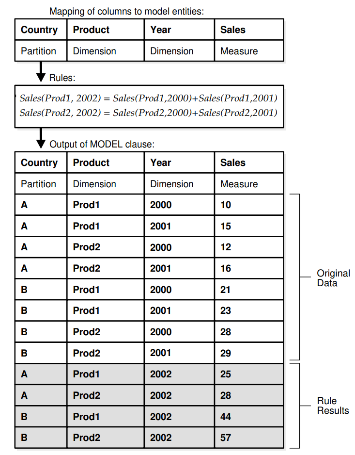 The MODEL clause enables you to specify rules to manipulate the measure values of the cells in the multi-dimensional array defined by partition and dimension columns. Rules access and update measure column values by directly specifying dimension values. The references used in rules result in a highly readable model. Rules are concise and flexible, and can use wild cards and looping constructs for maximum expressiveness. Oracle Database evaluates the rules in an efficient way, parallelizes the model computation whenever possible, and provides a seamless integration of the MODEL clause with other SQL clauses. The MODEL clause, thus, is a scalable and manageable way of computing business models in the database.